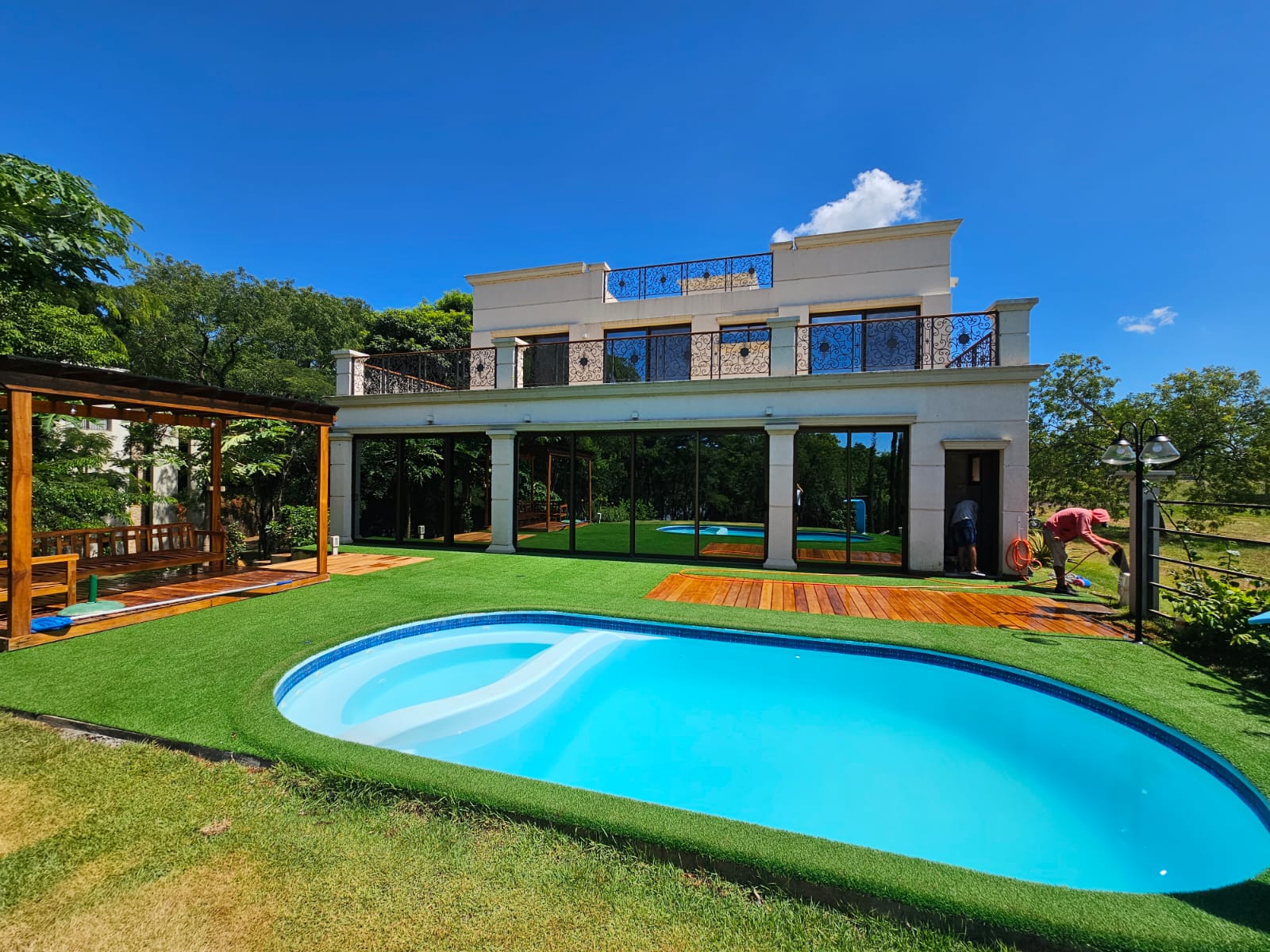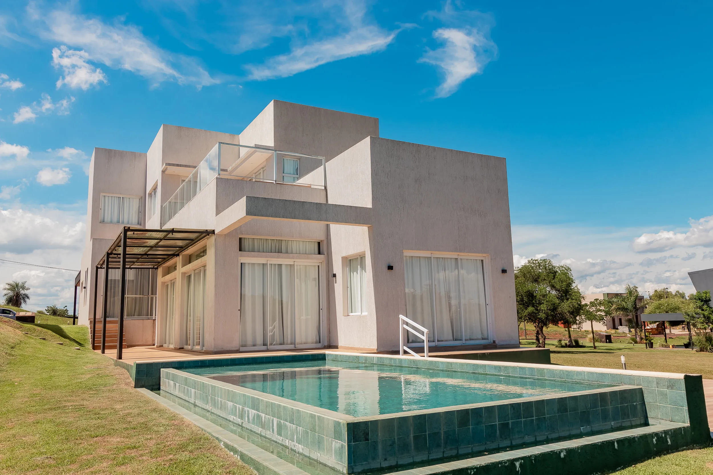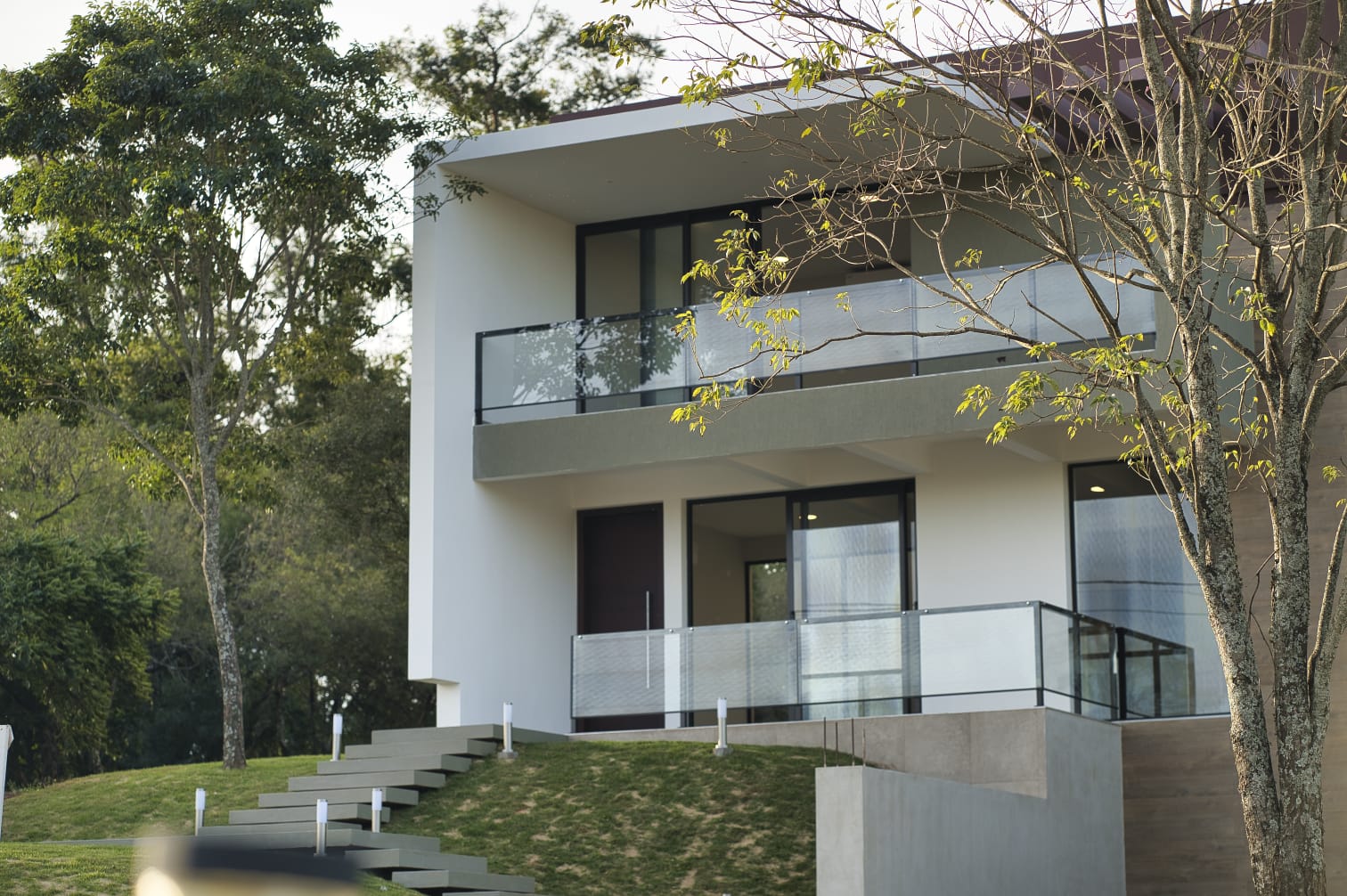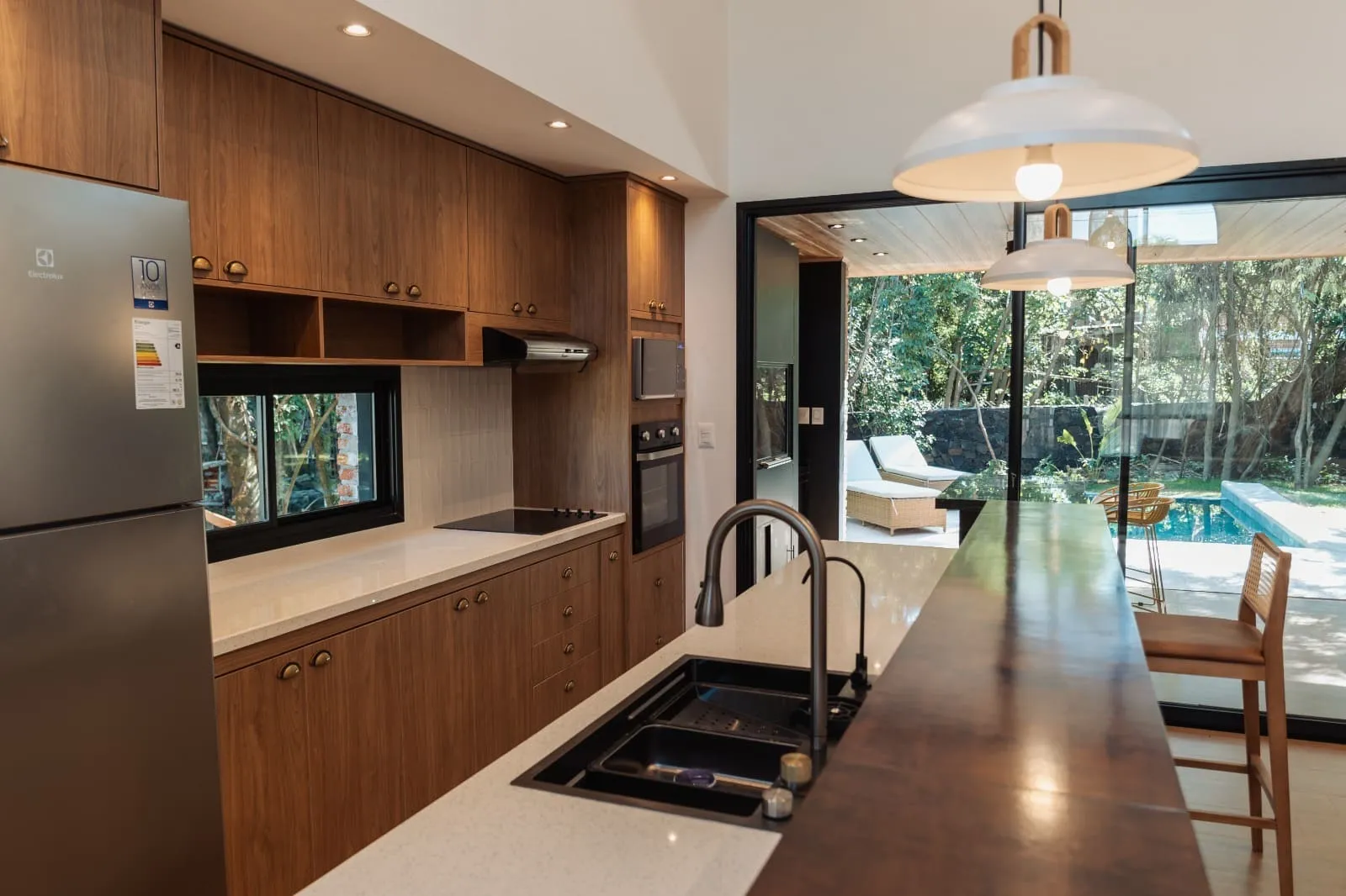 La casa fue implantada entre los árboles, aprovechando la sombra y la orientación natural para favorecer la ventilación cruzada y reducir el consumo energético. Los espacios interiores se abren hacia el exterior a través de grandes ventanales que conectan con la galería, la piscina y el jardín.